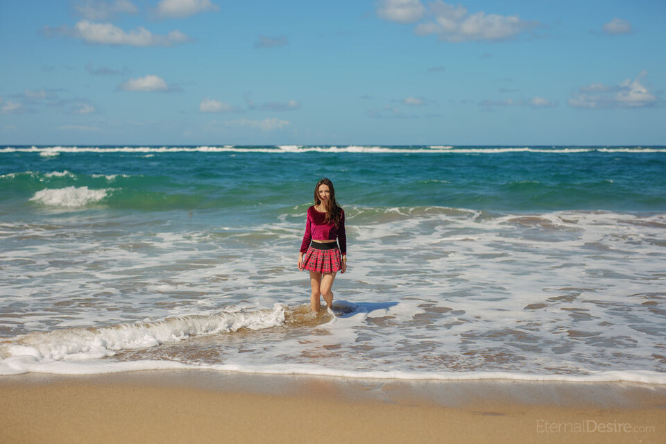 Check out this stunning photoshoot of Gloria Sol by Arkisi. Gloria poses both indoors on wicker furniture with a backdrop of blue curtains and outdoors on a beautiful beach. Her body is displayed in various poses, showcasing her natural beauty, from lying on her back with her legs spread to standing on the beach in a white top that barely covers her. The lighting captures her skin's texture and the curves of her body, making each shot a visual delight. The mix of settings adds a dynamic feel, contrasting the cozy indoor environment with the free, open space of the beach.